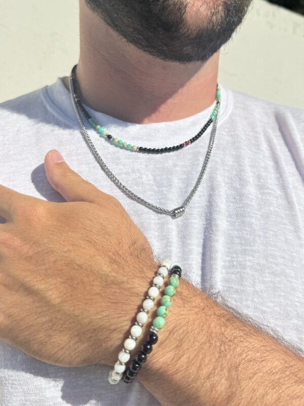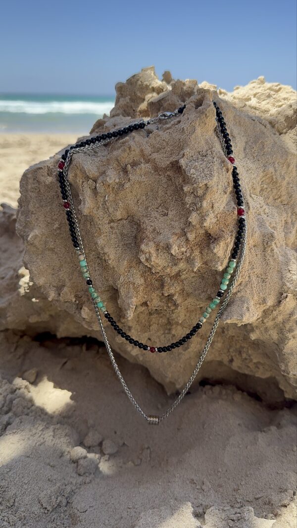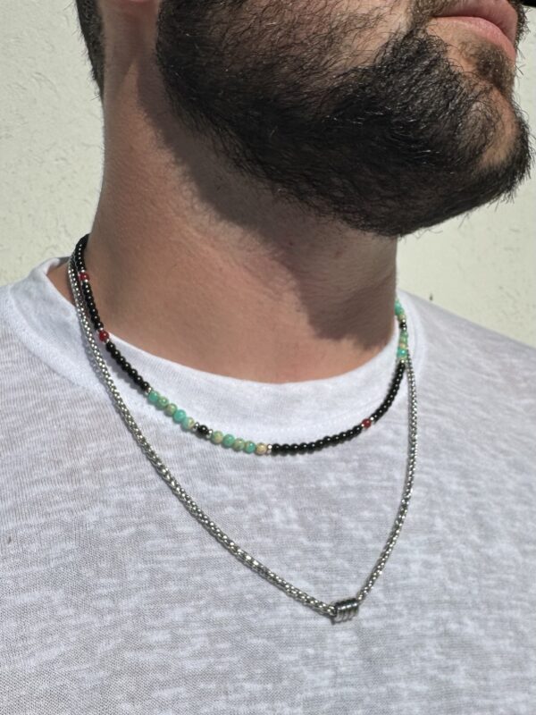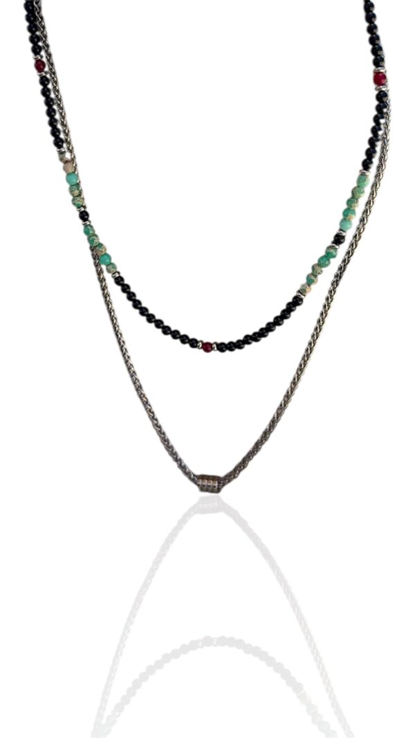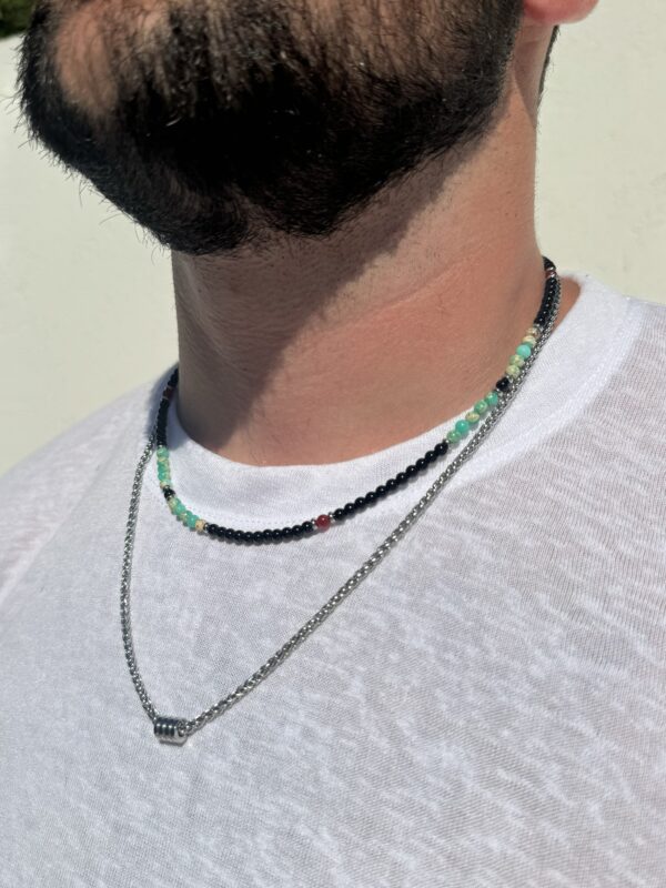 שרשרת לגברים בשתי שכבות: שכבה אחת מחרוזים שחורים עם ירוק שיש ונגיעות אדום, ושכבה שנייה משרשרת כסופה עם טבעות זזות במרכז.